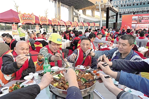 ■在广东奥林匹克体育中心十五运会主场馆项目工地主会场,一线劳动者代表共聚共享新春年夜饭。全媒体记者林景余/摄