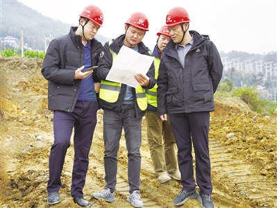 ■王少鹏(右一)与同事在施工现场做项目期策划。单位供图
