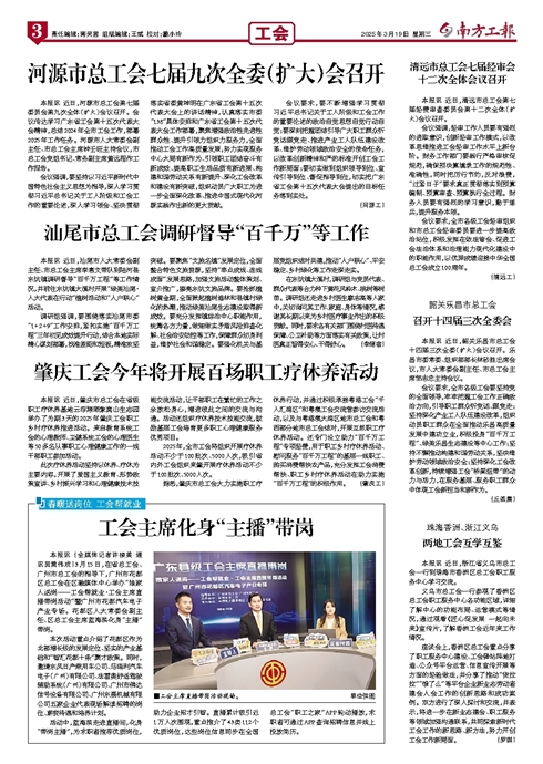 - 河源市总工会七届九次全委(扩大)会召开 本报讯 近日,河源市总工会第七届委员会第九次全体(扩大)会议召开。会议传达学习广东省工会第十五次代表大会精神,总结2024年全市工会工作,部署2025年工作任务。河源市人大常委会副主任、市总工会主