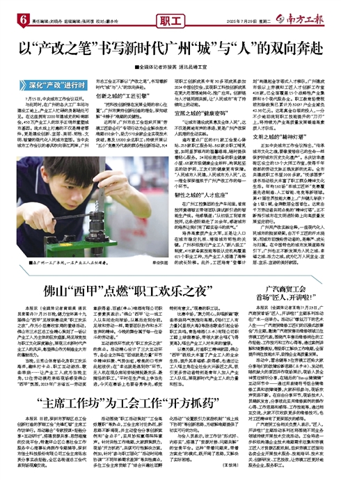 - 以“产改之笔”书写新时代广州“城”与“人”的双向奔赴 ■在广州一工厂车间,一名产业工人正忙碌着。单位供图 7月15日,中央城市工作会议召开。 与此同时,在广州的各大工厂车间与建设工地上,产业工人忙碌的身影随处可见。在这座拥有2200年建城史的