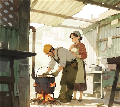 日子在工地上流淌,像搅拌机里翻滚的水泥,一层层地垒实着生活。父亲依然每天早早蹲在炉膛前,小心拨弄着柴火,母亲也依旧静静站在他身后。