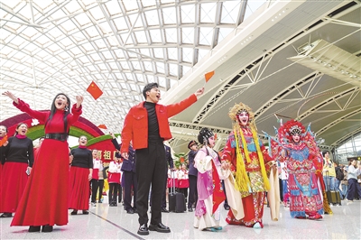 “我爱你中国”“祖国万岁”“元旦快乐”……1月1日上午,歌唱声、祝福声此起彼伏。广州、深圳、珠海、汕头、湛江等地共同举办《我爱你,中国》元旦快闪活动,以此展现新时代广东风貌,唱响人们对伟大祖国的挚爱和礼赞。当日,在广州南站、广州白云站、白云国际机场,一曲《我爱你,中国》在三个地点同时响起,吸引来自五湖四海的人们驻足,悠扬的歌声感染着每一位“在路上”的旅客。奏乐的小朋友、翩翩起舞的年轻人、深情跟唱的白发老人……三个地点分别以“温情·归乡之路”“创新·文化交融”“开放·国际交往”为主题,通过“同一时间+多地快闪”的特殊形式,充分彰显广州这个粤港澳大湾区核心城市的崭新面貌和多元活力。图为在广州南站候车大厅大家激情共唱《我爱你,中国》。