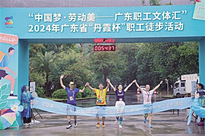 在粤北的韶关市丹霞山,广东省“丹霞杯”职工徒步活动更是吸引了上千名职工参与。2024年11月15日上午9时许,随着鸣笛声起,大家从丹霞山生态广场有序出发,途经沿江碧道、游船码头、福音峡、老山门等地,感受大自然奇幻瑰丽的生态画卷。活动现场还摆起长桌宴,两旁30余户商家进行本地农产品展示展销。仁化的灵芝、冬菇、木耳等干货,马坝的油粘米,乐昌的黄金奈李干等吸引职工选购。广州职工陈仨珂和队友在徒步活动中获奖,每人手提一箱农产品奖品,又在展区选购特产。“烟雨丹霞实在太美了!徒步活动集竞技性、观赏性、互动性于一体,现场还可以购买当地农产品与家人分享。主办方合理设置交通接驳线路,为我们带来了优质的服务体验,希望以后多开展这类活动。”陈仨珂笑着说道。