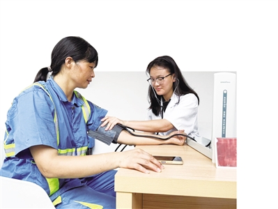■医学院志愿者为户外劳动者测量血压。单位供图