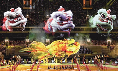■十五运会开幕式现场,巨型鳌鱼灯腾空而起,绕场飞行。新华社发