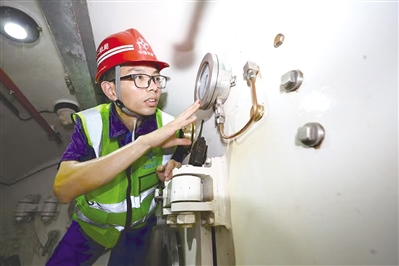 ■沈侃检查人闸仓副仓压力表。受访者供图