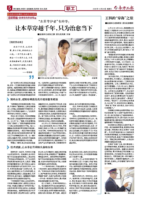 家门口那棵枝繁叶茂的老八角树和连片生长的肉桂林,是韦坤华童年最深刻的本草印记,也悄然在她心中播下与中药资源相守的种子。2011年,她在中国药科大学获中药学博士学位,这份源于乡土的本草情缘自此有了深耕的方向,她锚定中药资源保护与开发领域,正式开启属于自己“解码本草”的学术生涯,系统开展中药资源保护与开发研究。2014年,她被授予“全国五一劳动奖章”。