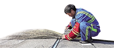 ▼在手工技能竞赛中,环卫工人手持葵苗、扎带等工具,专注地编织扫把。 单位供图