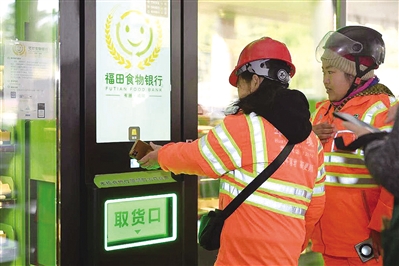 近日,深圳市福田区街头许多绿色柜子走红网络——这些被称作“食物银行”的智能柜机里,放满了蔬菜、面包、牛奶等食品,免费供人们取用。据了解,福田区“食物银行”公益项目自2022年5月启动至今,已累计投放22台智能柜机,覆盖辖区全部10个街道。爱心企业和超市捐赠的余量食品、临期食品,经质检合格后被放进智能柜机,按照“先特惠再普惠”的原则,优先向残疾人、失独老人、环卫工人等特殊群体提供,剩余食品每晚八点后面向所有市民开放。“食物银行”运行三年半以来,累计接收捐赠食物约50万份,相当于节约了195吨食物,惠及约50万人次。图为环卫工人在“食物银行”领取食品。