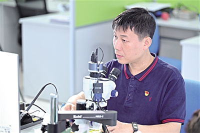 ■李天明在进行芯片焊盘检测修复。吴宇轩/摄