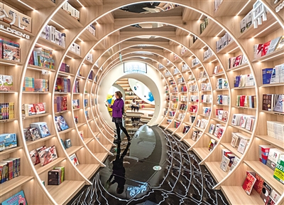 近日,位于广州市黄埔区的广州科学城云汇天地的愈欣书店新张开业,在喧嚣的城市生活里为读者提供了一处静谧的阅读与文化社交空间。走进书店,一下子就被那环形镜面构成的通道所吸引,书店采用双镜面设计,天花板与地板无限延伸形成视觉错位,环形书架如时空隧道,随手一拍便宛如置身赛博朋克世界,定格出极具风格的大片。目前,该书店已上架3万本书籍,涵盖经管、心理百科中外文学、社科少儿读物以及生活艺术等门类,满足多样化的阅读需求。