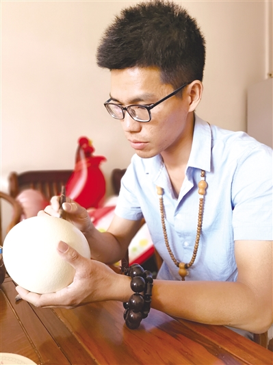 ▲徐茂深在鸵鸟蛋蛋壳上雕刻。