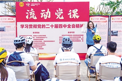 记者了解到,茅洲河工联会着力打造“思政+”多元场景,让教育真正“活”起来。该工联会采取“露天影院”模式,在工业园区开设“流动党课”,利用工余时间开展活动吸引职工参与,并结合互动问答增强参与感。在各类活动前,巧妙插入“黄金三分钟”微党课,实现思政教育“润物细无声”。更富创意的是“行走的课堂”。工联会联合企业工会组织红色主题骑行活动,职工们在骑行中聆听工运历史,感受城市变迁,用车轮踏寻新时代产业工人的“长征路”。