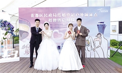 本报讯 (全媒体记者许接英 通讯员董业衡 廖艳辉)1月28日,广州市花都区民政局与广州白云国际机场股份有限公司携手共建的结婚登记户外颁证点授牌仪式在白云机场T3航站楼观景平台举行。这标志着全国首个设置于大型国际机场航站楼内的结婚登记户外颁证点正式启用。