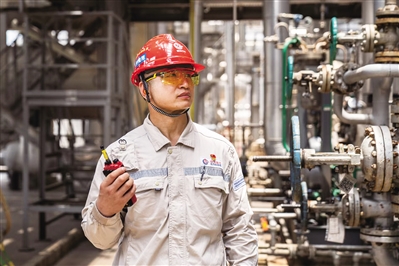 ■孙鹰翔正在生产装置区对关键设备运行参数进行细致排查。受访者供图
