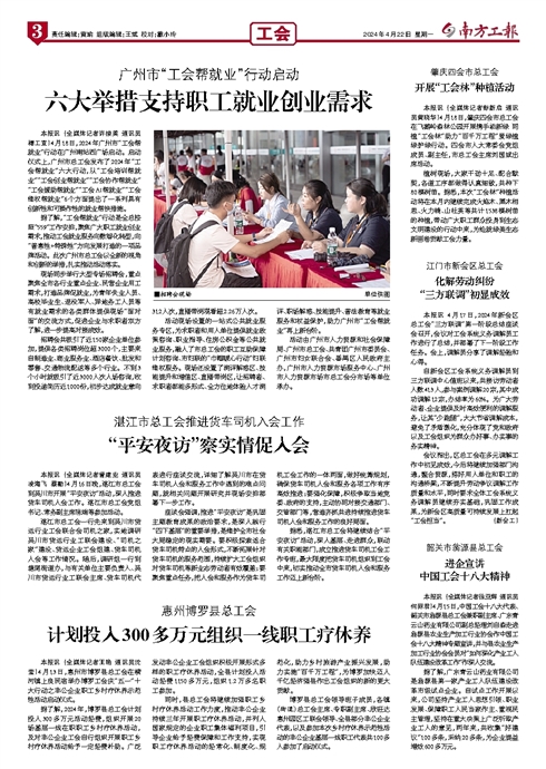 - 六大举措支持职工就业创业需求 ■招聘会现场 单位供图 本报讯 (全媒体记者许接英 通讯员穗工宣)4月18日,2024年广州市“工会帮就业”行动在广州南站西广场启动。启动仪式上,广州市总工会发布了2024年“工会帮就业”六大行动