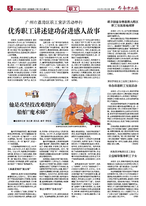 - 优秀职工讲述建功奋进感人故事 本报讯 (全媒体记者彭新启 通讯员朱龙威)4月18日,由广州市荔湾区总工会主办,区新业态行业工会联合会、区茶叶行业工会联合会协办的“聚荔发展·活力湾区”职工宣讲暨庆祝“五一”国际劳动节活动,在荔湾