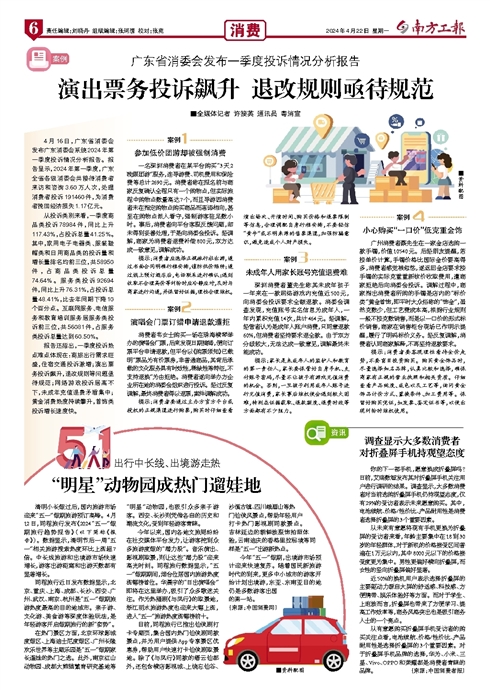- 演出票务投诉飙升 退改规则亟待规范 4月16日,广东省消委会发布广东消委会系统2024年第一季度投诉情况分析报告。报告显示,2024年第一季度,广东全省各级消委会共接待消费者来访和咨询3.60万人次,处理消费者投诉191460件,为消费