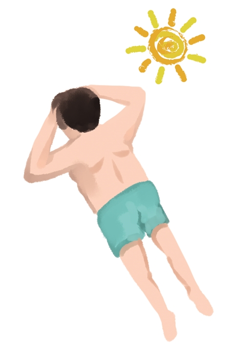 每次可先晒20—30分钟,看情况加到1小时,了解自己的耐受程度。裸露背部及四肢,直接与太阳光接触,男士可脱去上衣,女士可以选择小背心。