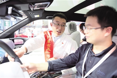 ▲马鸣波(左)为消费者介绍新车功能。全媒体记者郗建新/摄