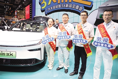 在广汽集团展馆现场,四位佩戴劳模绶带的广汽集团劳模职工马鸣波、孙庆勇、丰月和任建军,忙前忙后地为观展者介绍新车特点和功能,成了名副其实的“劳模中的车模、车模中的劳模”。他们手持“劳模带你看车展”的展牌,来回穿梭在展厅间,忙碌而醒目的身影成为车展现场一道独特的风景线。