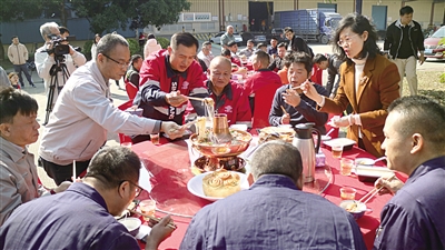 ■全总蹲点组与货车司机代表围坐吃羊肉火锅提前过冬至。全媒体记者彭新启/摄