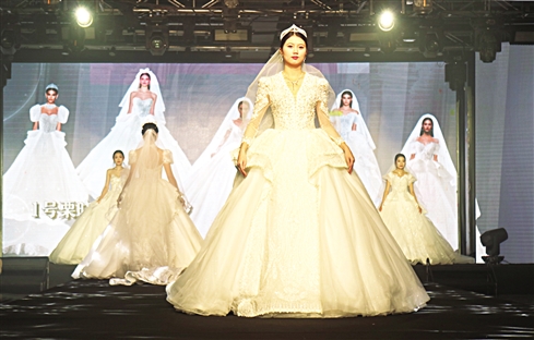 ■婚庆AI服装设计大赛决赛现场,模特展示婚纱系列设计作品。全媒体记者彭新启/摄