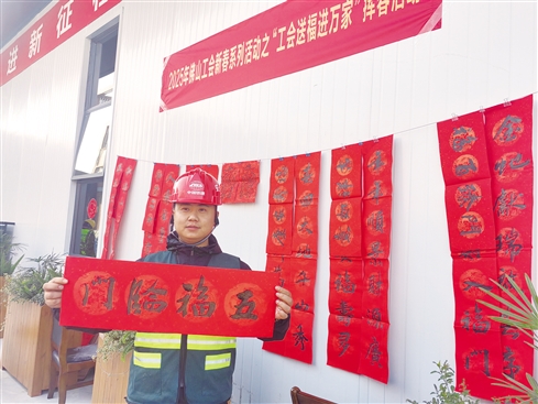 ■工人开心地收到佛山市总工会的“新春祝福”。全媒体记者黄细英/摄