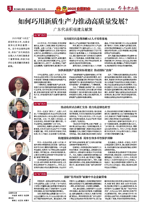 ◀黄秀芬 ◀丁雪梅 ◀沈燕芬 ◀任海 ◀黄达昌 2025年是“十四五”规划收官之年,也是全面深化改革的重要一年。在今年全国两会期间,来自广东代表团的全国人大代表们聚焦多个重要领域,