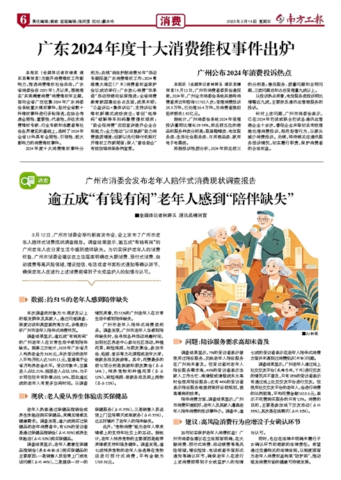 - 逾五成“有钱有闲”老年人感到“陪伴缺失” 3月12日,广州市消委会举行新闻发布会,会上发布了广州市老年人陪伴式消费现状调查报告。调查结果显示,逾五成“有钱有闲”的广州老年人在日常生活中感到陪伴缺失。为切实保护老年人的消费权益,广州