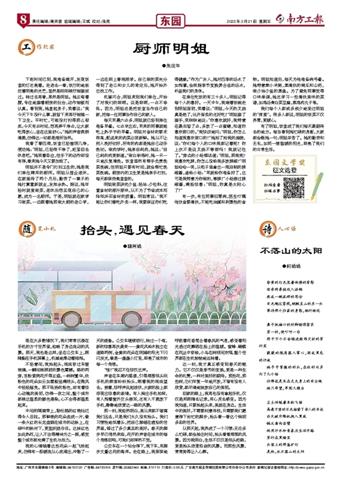 - 厨师明姐 下班时间已到,我准备离开,发现饭堂的灯还亮着。走进去一看,饭厅的地板泛着明亮的光芒,显然是刚刚被仔细擦拭过。转过去再看,果然是明姐。她正弯着腰,专注地擦着厨房的灶台,动作细致而认真。看到我,她直起