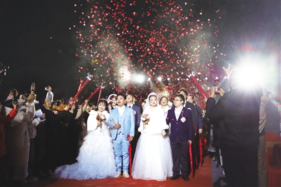 ■在漫天花雨中,百对新人步入会场。全媒体记者马大为/摄