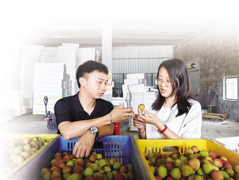 ■麦丹(右)多年来致力推动廉江荔枝产业商品化、标准化。全媒体记者誉建业/摄