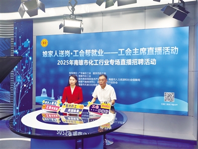 本报讯 近日,韶关南雄市总工会开展娘家人送岗·工会帮就业——工会主席直播活动。南雄市人大常委会副主任、市总工会主席田文斌化身“就业推荐官”,为求职者和企业搭建起“云端就业桥梁”。