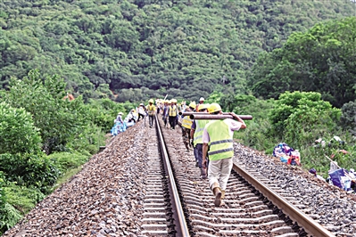 6月17日18时,暴雨如注,广铁集团肇庆工务段茂名桥隧车间主任甘小荣毅然踏上抢险征途。“水漫路封,从八甲站添乘机车绕行,近一个半小时才抵达现场。”回顾险情初至,他记忆犹新。抵达水害现场,甘小荣迅速进入“战斗状态”:组织队伍、调集机具、勘查水害,方案制定与材料估算同步推进,每一秒都为抢通争取主动。6月18日20时,他已连续坚守超24小时,电话铃声与山间虫鸣交织,沙哑嗓音仍清晰规划:“‘蝴蝶’台风刚过,强降雨又至,必须重点排查加固薄弱地段!”