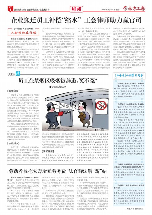 - 企业搬迁员工补偿“缩水” 工会律师助力赢官司 本报讯 (全媒体记者王艳)“黄律师,我拿到全额补偿了,谢谢!”近日,在广州市南沙区上班的卓师傅给工会律师黄喷发去微信,表达感激之情。 2024年,卓师傅所在的公司因经营调整,计划从广州市南沙区