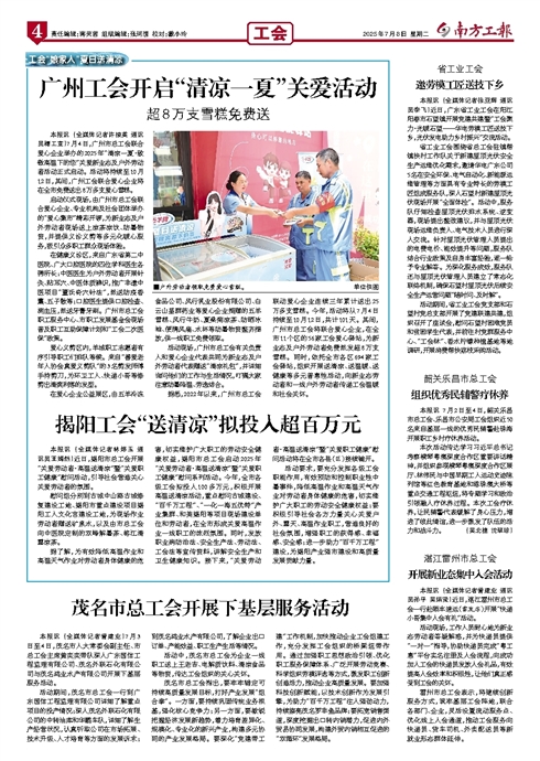 - 广州工会开启“清凉一夏”关爱活动 ■户外劳动者领取免费爱心雪糕。单位供图 本报讯 (全媒体记者许接英 通讯员穗工宣)7月4日,广州市总工会联合爱心企业举办的2025年“清凉一夏·致敬高温下的您”关爱新业态及户外劳动者活动正式启