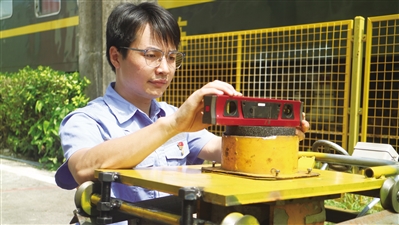 ■周意在检测钢轨轨底焊缝打磨设备。全媒体记者彭新启/摄