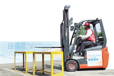 ▶参赛选手操纵叉车将红酒杯叠成高塔。李剑锋/摄