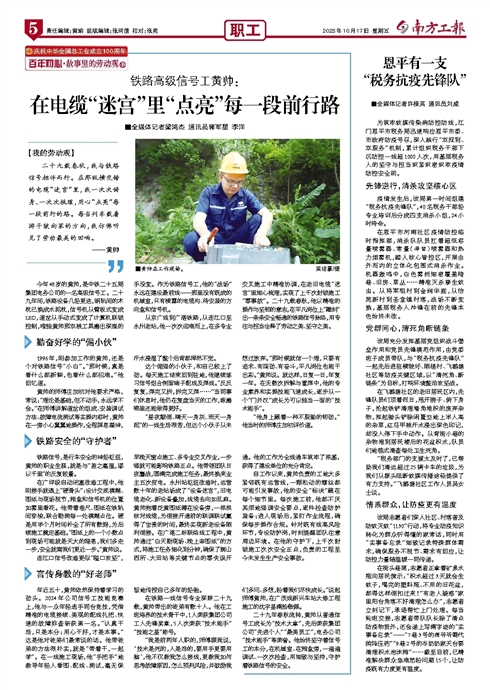 - 在电缆“迷宫”里“点亮”每一段前行路 ■黄帅在工作现场。吴培豪/摄 【我的劳动观】 二十九载春秋,我与铁路信号相伴而行。在那纵横交错的电缆“迷宫”里,我一次次俯身、一次次梳理,用心“点亮”每一段前行的路。每当列车载着游子驶向家