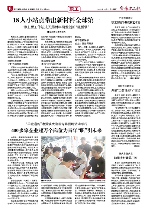- 400多家企业超万个岗位为青年“职”引未来 ■招聘会现场。全媒体记者彭新启/摄 本报讯 (全媒体记者彭新启 通讯员李鸿瑶)10月17日,由广州市人力资源和社会保障局牵头主办的2025年“羊城邀约”粤港澳大湾区专场招聘活动在暨南大学石牌校