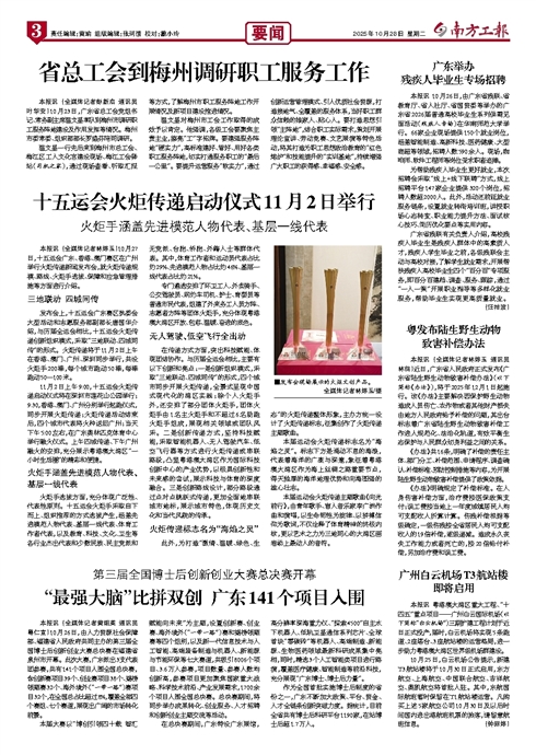 - “最强大脑”比拼双创 广东141个项目入围 本报讯 (全媒体记者黄细英 通讯员粤仁宣)10月26日,由人力资源社会保障部、福建省人民政府共同主办的第三届全国博士后创新创业大赛总决赛在福建省泉州市开幕。此次大赛,广东派出3支代表团参赛,共有1