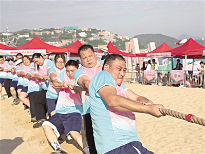 竞技项目“沙滩拔河”是本次赛事的核心环节。各参赛队伍队员们紧握长绳,身体后倾,眼神坚定,随着裁判一声哨响,双方队员瞬间发力,绳子上的红线在两队之间来回移动,队员们咬紧牙关、全力以赴。赛场边的加油声、呐喊声此起彼伏,响彻海滨。