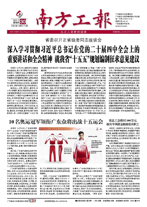 - 深入学习贯彻习近平总书记在党的二十届四中全会上的重要讲话和全会精神 就我省“十五五”规划编制征求意见建议 本报讯 10月28日,省委召开正省级老同志座谈会,深入学习贯彻习近平总书记在党的二十届四中全会上的重要讲话和全会精神,全面贯彻落实总书记对广东系列重要讲话和重要指示精神,就推动我省“十五五”时期发