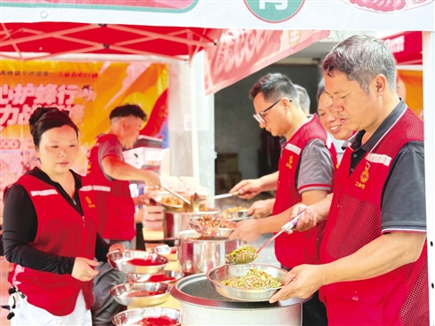 本报讯 (全媒体记者马大为 通讯员黄嘉明)11月5日,正值“双11”快递高峰期,在深圳市宝安区石岩街道南岗工业园的顺丰速运阳光分部门口,一处既醒目又温馨的“工会移动厨房”悄然亮相。这是由顺丰深莞区工会主办的“暖心护蜂行 聚力战高峰”慰问活动现场(见上图,黄嘉明/摄)。