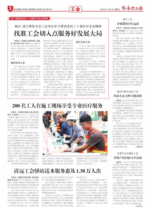 - 找准工会切入点服务好发展大局 本报讯 (全媒体记者彭新启 誉建业 通讯员叶华安 孙平)近日,梅州市总工会、湛江市总工会分别召开会议,传达学习贯彻党的二十届四中全会精神,全力推进全年目标任务落实落地,确保“十四五”工会工作圆满收