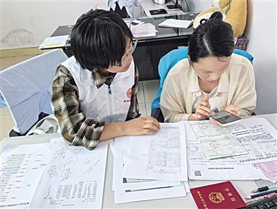 ■工联会干部丁凌云(左)帮助困难职工申领帮扶政策。单位供图