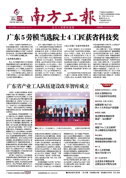 - 广东5劳模当选院士4工匠获省科技奖 本报讯 (全媒体记者黄细英)近日,科技领域喜讯频传,中国科学院与中国工程院公布2025年院士增选结果,广东省政府官网也揭晓2024年度广东省科学技术奖名单。在这两份备受瞩目的榜单中,广东多名劳模工