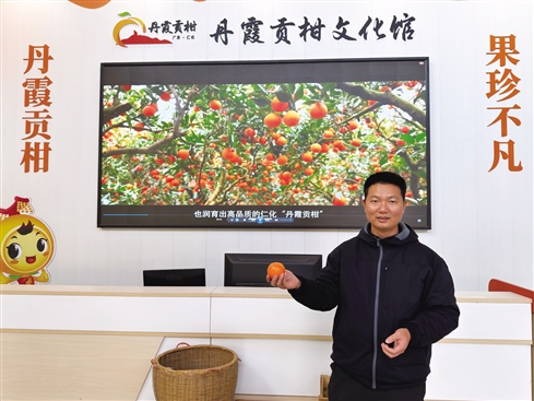 ■陈广财在介绍丹霞贡柑。