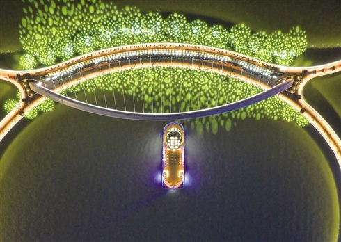 ■夜幕下,广州海心桥的灯光在江面映射成一片“光斑花海”。